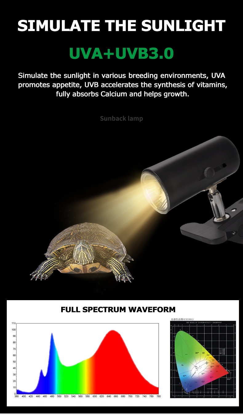 Simulate the sunlight in various breeding environments, UVA promotes appetite, UVB accelerates the synthesis of vitamins, fully absorbs Calcium and helps growth.