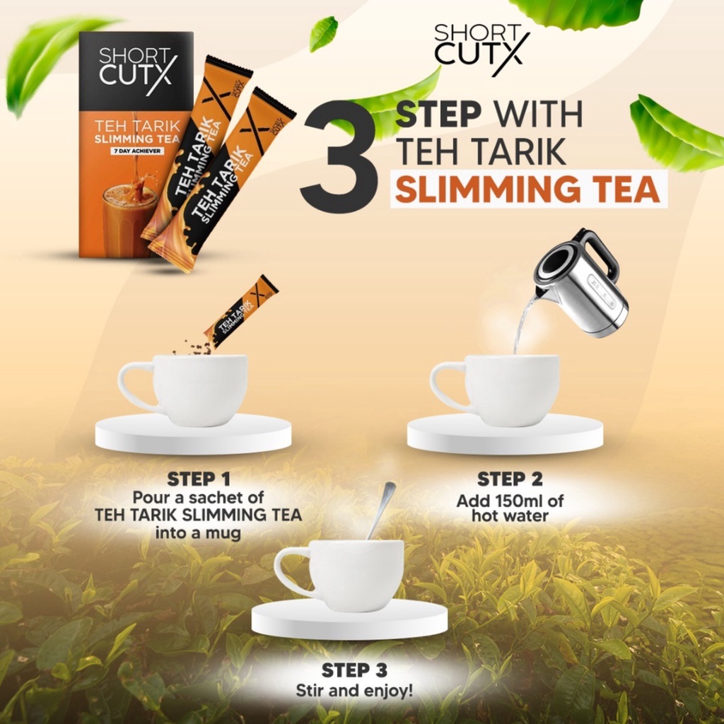 Get the boost you need to jumpstart your health and fitness goals with Shortcutx Teh Tarik Slimming Tea. The combination of our powerful all natural ingredients work together to create a natural cleanse and full body detox which kicks the body in high gear for achieving your wellness goals. Our ingredients are designed to stimulate the body's ability to process excess fats, improve blood circulation and stimulate blood circulation. The result is an aromatic cup of tea that has a lasting effect.