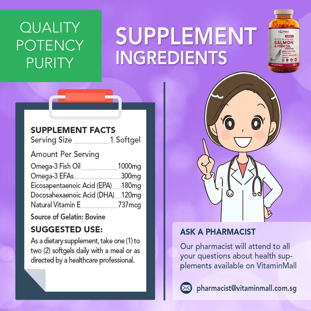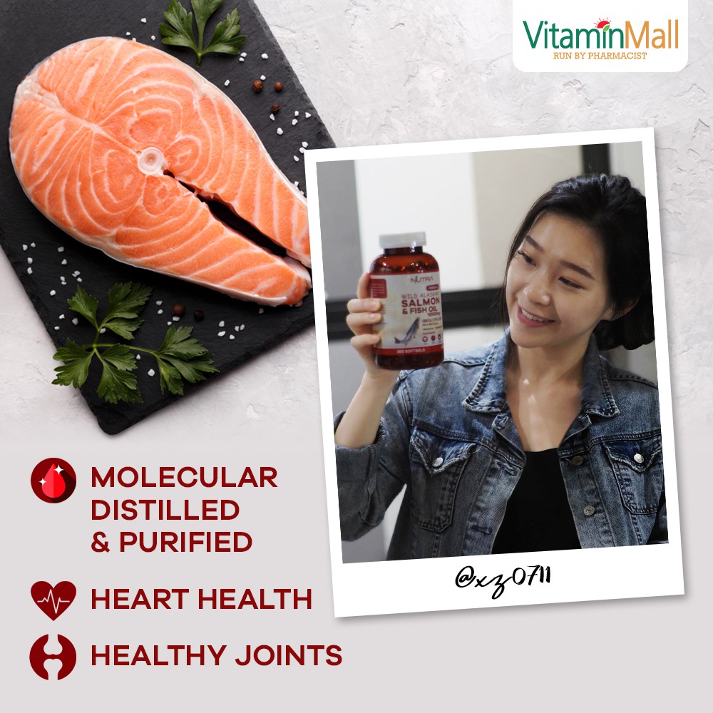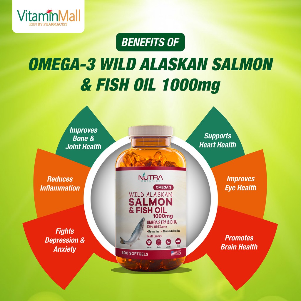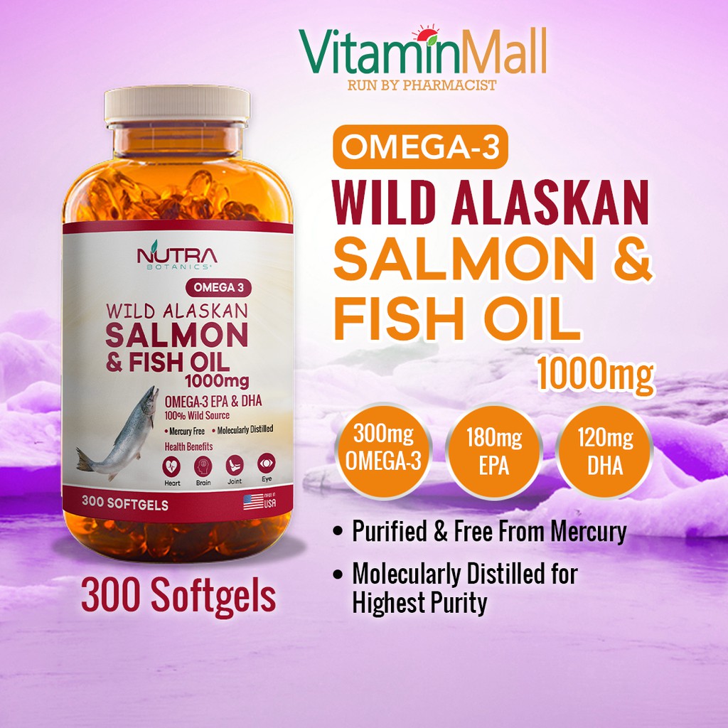 Nutra Botanics Wild Alaska Omega 3 Salmon Fish Oil 1000mg provides an excellent source of Omega-3 EPA and DHA, omega fatty acids that are good fats which has clinically shown to support a healthy heart, and brain and cardiovascular health by maintaining normal blood pressure and cholesterol level which reduces the risks of cardiovascular diseases such as heart attack and strokes. EPA may also assist to maintain healthy joints while DHA is a primary component of our human brain and eye.