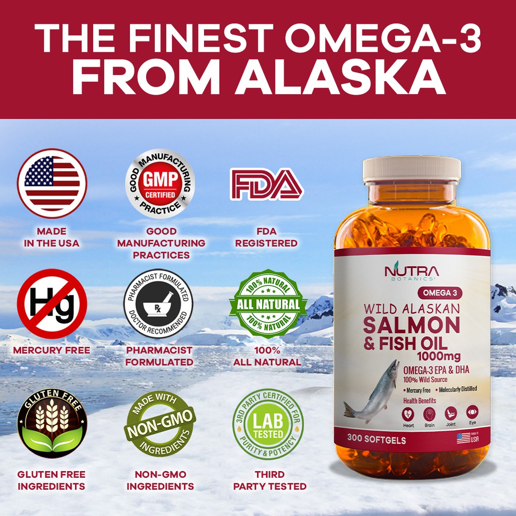 Nutra Botanics Wild Alaskan Omega 3 Salmon Fish Oil 1000mg is a superior quality Omega 3 fish oil supplement made from 100% fresh wild Alaskan salmon and other cold water fishes like anchovy and sardines caught in the pristine water of the Alaska sea widely regarded as the cleanest waters in the world. This superior quality Omega 3 Fish Oil supplement is molecularly distilled and ultra-purified to remove mercury and all harmful toxins making Nutra Botanics Wild Alaskan Omega 3 Salmon Fish Oil 1000mg unmatched in its purity and quality. Vitamin E is added as an antioxidant to maintain superior freshness.
