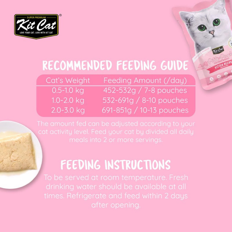 Kit Cat Petite Wet Food is formulated to meet all the nutritional levels established by AAFCO Cat Food Nutrient Profiles. This certifies that Kit Cat Petite Pouch is a nutritionally complete product that can be fed to your cat as its sole ration without adding any other substance except water.