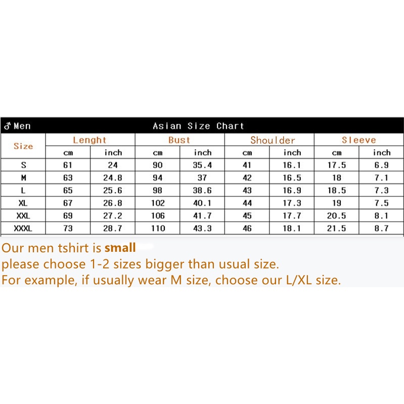 Our men tshirt is 1-2 sizes smaller than usual size.If want to be slim, please choose 1 size bigger than usual size!If want to be casual, please choose 2 sizes bigger than usual.