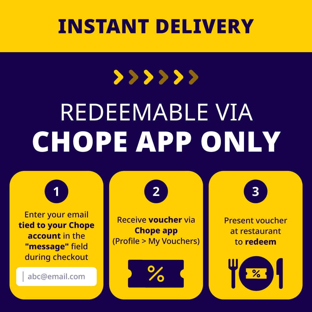 2. Voucher can only be redeemed via the Chope app. At checkout, enter your email tied to your Chope account in the "message" field.