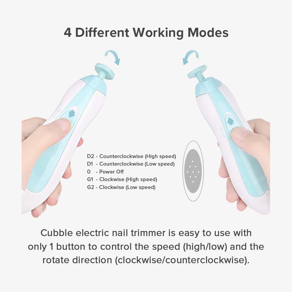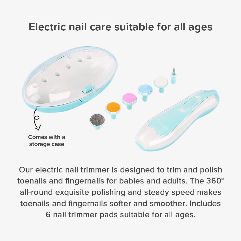 Cubble Electric Baby Nail Trimmer is designed to trim and polish toenails and fingernails for babies and adults, it won’t be damage cuticles or nail beds, 360°all-round exquisite polishing and steady speed makes toenails and fingernails softer and smoother.