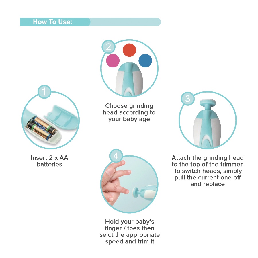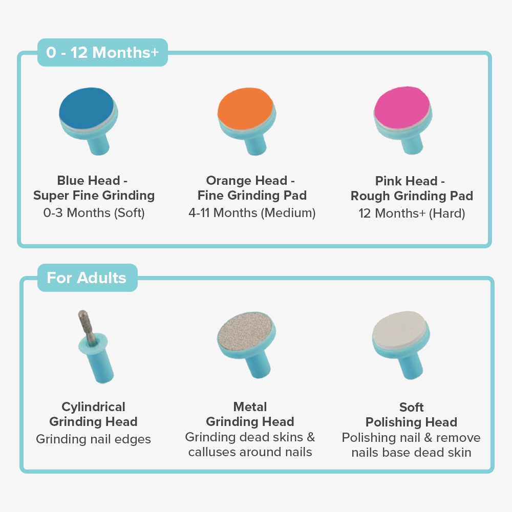 Our baby nail trimmer comes with 4 cushioned sandpapers file head trimmer pads, and 2 file head trimmer pads for adults (Including 1 special tool for CALLUS REMOVAL). The different colored nail trimmer pads are designed for different stages of babies growth and various needs. 6 nail trimmer pads suitable for all ages.