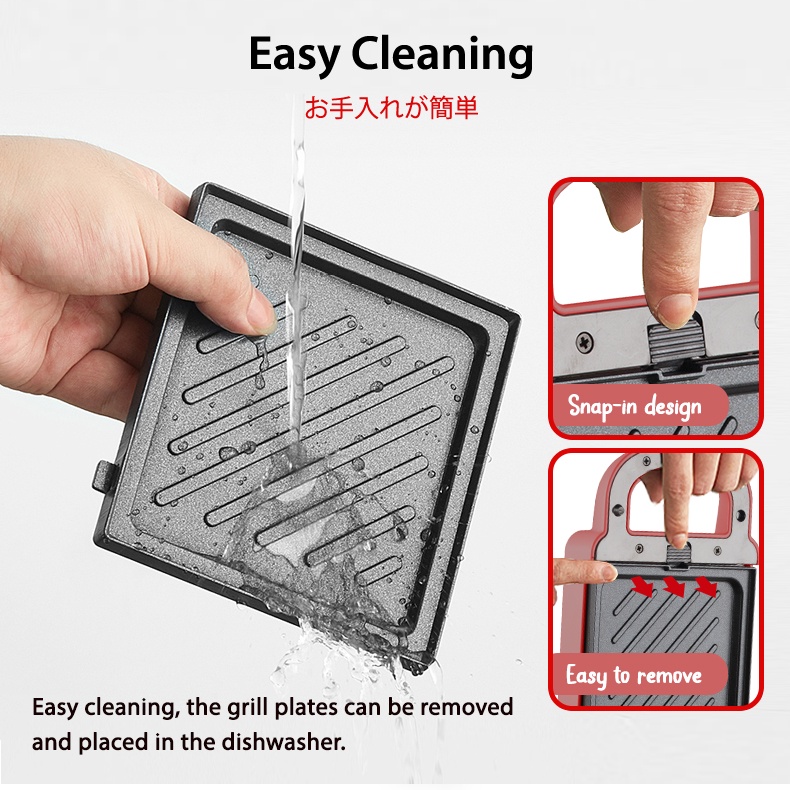• Easy to clean, the grill plates can be removed and placed in the dishwasher